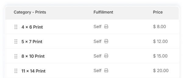 Create personalized price lists for prints, downloads, or packages. Set your markups and offer products like fine art prints, wall art, or digital files.