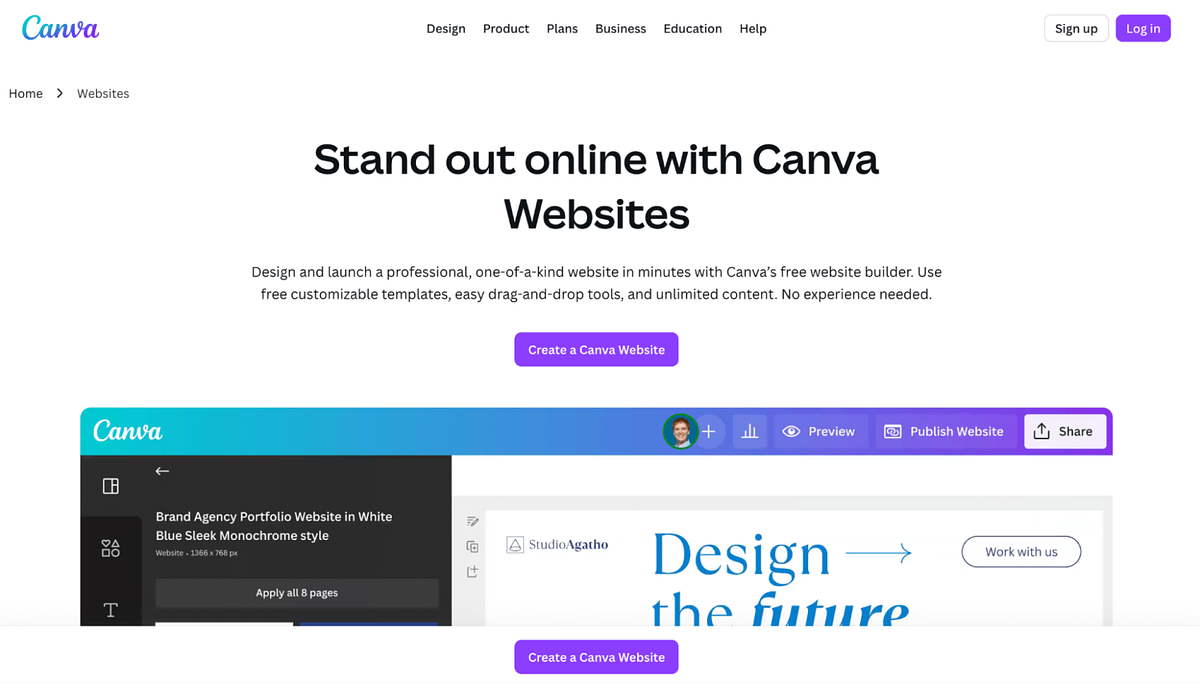 - Интуитивно понятный редактор перетаскивания Canva делает создание веб-сайтов невероятно простым для тех, кто не является дизайнером.