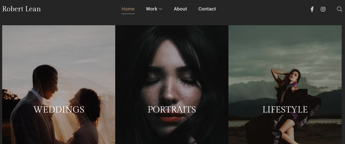 L'aspect minimaliste se retrouve également dans la barre de navigation épurée, qui propose des options de menu essentielles. Les icônes des réseaux sociaux sont discrètement intégrées dans la barre de navigation, offrant un accès facile à la présence en ligne du photographe.
