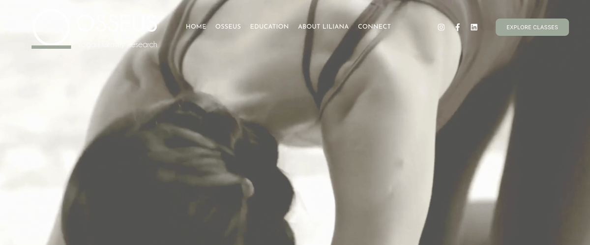 The homepage's hero section features an auto-playing black and white video of yoga poses, creating a serene and immersive experience for visitors.