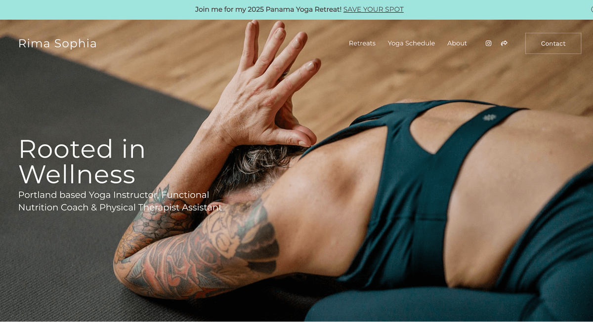 The homepage's hero section features a large banner image of Rima in a yoga pose, with a caption over it providing a brief biography.